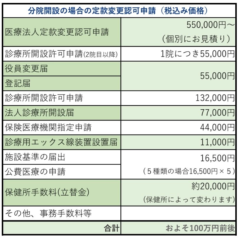 こちらの料金表は【新たに診療所等を開設する場合=分院開設】の場合の一例です。